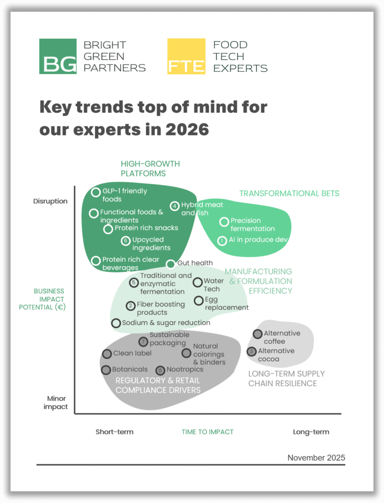 The analysis highlights several high-growth platforms already gaining strong momentum — including GLP-1 friendly foods, functional ingredients, hybrid meat and fish, and upcycled ingredients. At the same time, technologies such as AI in product development and precision fermentation are emerging as powerful drivers of long-term disruption.